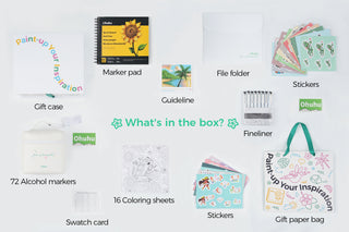 ※Ohuhu Alcohol Marker Gift Box Set: A perfect gift for anyone who loves illustration, sketching, coloring, doodling and drawing! The set includes Ohuhu Honolulu 72-color alcohol markers, a marker sketchbook, an 8-pack fine line drawing pen set, and 16 coloring sheets, providing all the basic necessities for alcohol marker enthusiasts.